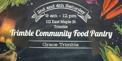 Community food pantry feeding families in need open 9 am - 12 pm on the 2nd and 4th Saturday each month. Donations can be dropped off at Trimble City Hall, office of Darla Todd licensed professional counselor or call our number: 816-539-2548. Located at Grace Community Church, 112 East Maple Street, Trimble, MO.